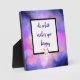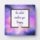 A decorative quote plaque with an inspirational quote which says "do what makes you happy". Illustrated with a cute kawaii bunny face holding a heart. The background is an abstract watercolor painting with luminous space clouds in soft pastel colours.