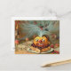 Happy Jack-o-Lantern sits on top of a cake.  Witches and devils fly overhead.  Vintage cartoon design.