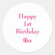 Happy 1st First Birthday Pink White Custom Name Classic Round Sticker