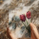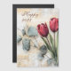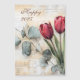 The calendar showcases a vintage design with a distressed wood background and script overlay. Two red tulips and eucalyptus leaves add a touch of nature and elegance. The year "2025" and the word "Happy" are displayed in decorative script.