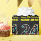 This fun birthday themed wrapping paper design features a large number "24", filled with a colourful star shapes pattern. It also features the message "Happy 24th Birthday,", and a custom name. The background is coloured black. Wrapping paper like this might be used when giving a gift or present in honour of somebody’s twenty fourth birthday. [~Z0000429]