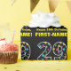 This fun birthday-themed wrapping paper design features a large number "29", filled with a colourful star shapes pattern. It also features the message "Happy 29th Birthday,", and a personalised name. The background is coloured black. Wrapping paper like this might be used when giving a gift or present in honour of somebody’s 29th birthday. [~Z0000429]