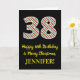 The front of this fun and simple Christmas themed and birthday themed December 25th birthday greeting card design features a large number "38" with a green, white, and red stripes pattern, along with the message "Happy 38th Birthday & Merry Christmas,", and a customizable name. The background of the front is colored black. The inside features a personalized birthday greeting message, or could perhaps be cleared and left blank if a message is to be written by hand instead. A customizable birthday card like this might be a fun way to send a message in celebration of somebody’s thirty eighth birthday that also falls on December 25th (Christmas Day). [~Z0000405]