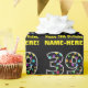 This fun birthday themed wrapping paper design features a large number "39" filled with a colourful star shapes pattern, along with the message "Happy 39th Birthday,", and a custom name. The background is coloured black. Wrapping paper like this might be a fun way of wrapping a birthday present or gift being given to somebody who is celebrating their thirty ninth birthday. [~Z0000429]