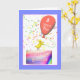 A cute and festive birthday card with my design of a little chicken standing on a birthday cake holding a balloon that says "3 years old!" with my verse inside.