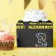 This fun birthday themed wrapping paper design features a large number "3", filled with a colourful star shapes pattern. It also features the message "Happy 3rd Birthday,", and a custom name. The background is coloured black. Wrapping paper like this might be used when wrapping gifts being given to somebody in celebration of their third birthday. [~Z0000429]