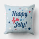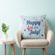 Stylish patriotic Fourth of July holiday throw pillow design features an "Happy 4th of July" quote script typography text design in red, white, blue, and navy blue colours with star accents and light blue background colour.
