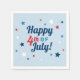 Stylish patriotic Fourth of July holiday napkin design features an "Happy 4th of July" quote script typography text design in red, white, blue, and navy blue colours with star accents and light blue background colour.