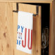 Patriotic kitchen towel features "Happy 4th of July" in red, white and blue text with "4th in a shimmery glitter fill".