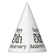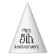 These party hats feature the words "Happy 5th Anniversary" in a unique print font with gold letters black outline. All paper hats have an attached elastic string printed in full vibrant colours made in the USA has a Minimum of 12 order requirement.