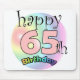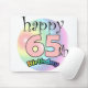 Gelukkige 65ste verjaardag muismat Leuk als cadeau voor iemand die vijfenzestig is geworden. Regenboog kleuren. 65 is in de roze kleur.