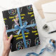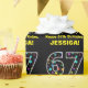 This fun birthday-themed wrapping paper design features a large number "67", filled with a pattern of star shapes of various colours and sizes. It also features the message "Happy 67th Birthday,", and a custom name. The background is coloured black. Wrapping paper like this might be used when wrapping gifts being given to somebody in celebration of their sixty seventh birthday. [~Z0000429]