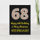 The front of this simple and fun Christmas-themed and birthday-themed December 25th birthday greeting card design features a large number "68" with a green, white, and red stripes pattern, along with the message "Happy 68th Birthday & Merry Christmas,", and a custom name. The background of the front is coloured black. The inside features an editable birthday greeting message, or could perhaps be cleared and left blank if a message is to be written by hand instead. A customisable birthday card like this might be a fun way to send a message in celebration of somebody’s sixty eighth birthday that also falls on Christmas Day (December 25th). [~Z0000405]