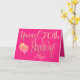 A design of decorative lettering in gold on a hot pink backdrop to wish a Happy 70th birthday. Happy Birthday is set in an ornate script, and the age is in a cordinating typeface with name in script at the bottom. Easily personalise the name and words inside to your own greeting if you wish. Faux sparkly balloons add razzle dazzle on the front! The same colour hot pink background continues on the inside.
