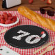 70th birthday party with bold black and white happy 70 text on black with party balloon bouquet.