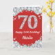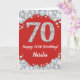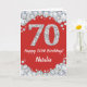Happy 70th Birthday Red and Silver Glitter Card with personalised name. For further customisation, please click the "Customise it" button and use our design tool to modify this template.