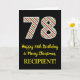 The front of this fun and simple Christmas-themed and birthday-themed December 25th birthday greeting card design features a large number "78" with a green/white/red stripes pattern, along with the message "Happy 78th Birthday & Merry Christmas,", and a customizable name. The background of the front is colored black. The inside features a personalized birthday greeting message, or could perhaps be cleared and left blank if a message is to be written by hand instead. A personalized birthday card like this might be a fun way to send a message in celebration of somebody’s seventy eighth birthday that also falls on Christmas Day (December 25th). [~Z0000405]