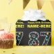 This fun birthday themed wrapping paper design features a large number "87", filled with a pattern of star shapes having various sizes and colours. It also features the message "Happy 87th Birthday,", and an editable name. The background is coloured black. Wrapping paper like this might be used when giving a gift or present in honour of somebody’s eighty seventh birthday. [~Z0000429]