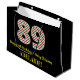 This fun and simple Christmas-themed and birthday-themed December 25th birthday gift bag design features a large number "89" with a green, white, and red stripes pattern, along with the message "Happy 89th Birthday & Merry Christmas,", and an editable name. The background is coloured black. A gift bag like this might be a fun way to wrap gifts or presents that are being given to somebody who was born on Christmas Day (December 25th) and who is celebrating their eighty ninth birthday. [~Z0000407]