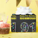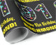 This fun birthday-themed wrapping paper design features a large number "91" filled with a pattern of decorative star shapes having various colours and sizes, along with the message "Happy 91st Birthday,", and a personalised name. The background is coloured black. Fun wrapping paper like this might be used when wrapping presents being given to somebody in celebration of their 91st birthday. [~Z0000429]
