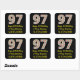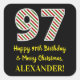 This fun and simple Christmas themed and birthday themed December 25th birthday sticker design features a large number "97", with a green/white/red stripes pattern. It also features the message "Happy 97th Birthday & Merry Christmas,", and a customisable name. The background is coloured black. Stickers like this might be a fun way of preparing gifts or presents that are being given to somebody who was born on Christmas Day (December 25th) and who is celebrating their ninety seventh birthday. [~Z0000409]
