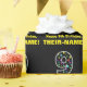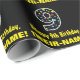 This fun birthday-themed wrapping paper design features a large number "9", filled with a pattern of star shapes of various sizes and colours. It also features the message "Happy 9th Birthday,", and a personalised name. The background is coloured black. Wrapping paper like this might be used when giving a gift or present in honour of somebody’s 9th birthday. [~Z0000429]