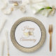 Party paper plate shown in a lovely Gold faux glitter print around the rim and White centre. Happy Anniversary in a fancy script in centre with two interlinked hearts.