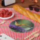 This anniversary paper plate features a butterfly collecting nectar from a butterfly bush.