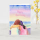 Happy Anniversary personalised card. Watercolor ai art depicting two woman in love hugging each other at the beach. Pretty pink and blue skies.