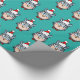 This festive wrapping paper print pattern features a blue-eyed owl with Santa hat and rosy cheeks set on a turquoise background with snowflakes.