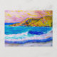 shows a colourful cove and wave splash in laguna beach california! also with "happy beachcombing" slogan
