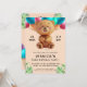 Celebrate your child’s special day with this adorable bear design! A cuddly teddy bear holding colourful balloons, surrounded by soft leaves in gentle pastel shades, creates a joyful vibe for a birthday celebration. Add your child’s name and event details to create a charming keepsake. It’s a perfect way to invite guests to a day of fun and smiles!