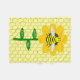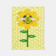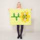 This awesome fleece blanket features a graphic image of a cute yellow bumblebee with black stripes, eyes, antennae and legs. It has pretty blue and white wings. The bee is sitting on the middle of a golden yellow sunflower. The flower has a green stalk and three leaves. The message "happy bee day" appears spread over the three leaves. The background is composed of a yellow honeycomb pattern.