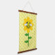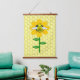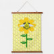 This awesome wood topped wall tapestry features a graphic image of a cute yellow bumblebee with black stripes, eyes, antennae and legs. It has pretty blue and white wings. The bee is sitting on the middle of a golden yellow sunflower. The flower has a green stalk and three leaves. The message "happy bee day" appears spread over the three leaves. The background is composed of a yellow honeycomb pattern.