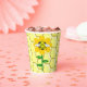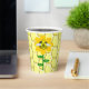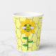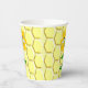 This awesome set of paper cups features a graphic image of a cute yellow bumblebee with black stripes, eyes, antennae and legs. It has pretty blue and white wings. The bee is sitting on the middle of a golden yellow sunflower. The flower has a green stalk and three leaves. The message "happy bee day" appears spread over the three leaves. The background is composed of a yellow honeycomb pattern.