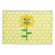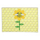 This awesome pillowcase features a graphic image of a cute yellow bumblebee with black stripes, eyes, antennae and legs. It has pretty blue and white wings. The bee is sitting on the middle of a golden yellow sunflower. The flower has a green stalk and three leaves. The message "happy bee day" appears spread over the three leaves. The background is composed of a yellow honeycomb pattern.