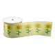 This awesome ribbon features a graphic image of a cute yellow bumblebee with black stripes, eyes, antennae and legs. It has pretty blue and white wings. The bee is sitting on the middle of a golden yellow sunflower. The flower has a green stalk and three leaves. The message "happy bee day" appears spread over the three leaves.