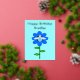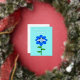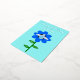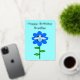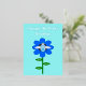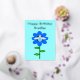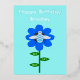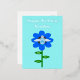This awesome foil postcard features a graphic image of a cute blue bumblebee with bright blue stripes, black eyes, blue antennae and black legs. It has pretty blue and white wings. The bee is sitting on the middle of a pretty blue sunflower. The flower has a green stalk and three leaves. The message "Bee Day boy" appears spread over the three leaves. There is custom text at the top in beautiful silver foil so you can include a message.