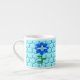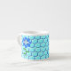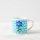 This awesome espresso mug features a graphic image of a cute blue bumblebee with bright blue stripes, black eyes, blue antennae and black legs. It has pretty blue and white wings. The bee is sitting on the middle of a pretty blue sunflower. The flower has a green stalk and three leaves. The message "Bee Day boy" appears spread over the three leaves. The background is composed of a pale blue honeycomb pattern.