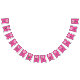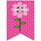 This awesome bunting features a graphic image of a cute pink bumblebee with bright pink stripes, black eyes, pink antennae and black legs. It has pretty blue and white wings. The bee is sitting on the middle of a pretty pink sunflower. The flower has a green stalk and three leaves. The message "Bee Day Girl" appears spread over the three leaves. The background is composed of a bright pink honeycomb pattern.