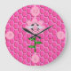 This awesome clock features a graphic image of a cute pink bumblebee with bright pink stripes, black eyes, pink antennae and black legs. It has pretty blue and white wings. The bee is sitting on the middle of a pretty pink sunflower. The flower has a green stalk and three leaves. The message "Bee Day Girl" appears spread over the three leaves. The background is composed of a bright pink honeycomb pattern.