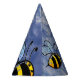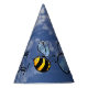 Buzz the bee, is back with a bee day party hat, happy bees, in a pretty blue sky with fluffy cloudy.