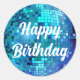stylish happy birthday 3d blue disco ball white calligraphy Classic Round Sticker