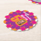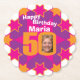 50th purple, pink and orange yellow birthday party paper coasters. Great to add a personal touch to a surprise 50th birthday celebration party. Personalize with your birthday girls photo in the 0 of 50 and personalize with your choice of name. Design by Sarah Trett for www.mylittleeden.com
