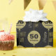 Gold simulated glitter balloons with strings make a continuous pattern out of the age 50 and the birthday person's name. "Happy Birthday" hugs the balloon string on a black background. The perfect wrapping paper for any glamourous 50 year old.
