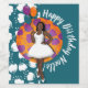 This design features a beautiful Black woman in a white dress and shoes on a teal and orange background with pink flowers, holding 3 balloons.