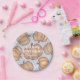 This charming and whimsical party plate is ideal for a fall birthday celebration. It showcases a delightful blue and white polka dot backdrop adorned with adorable orange and brown pumpkins painted in watercolour. You can personalise it with the birthday child’s name and birthdate. Perfect for autumn children’s birthday parties.