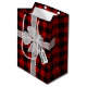 White sheer bow with gift tag on red and white buffalo plaid pattern.