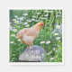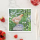 These birthday chicken napkins feature a beautiful buff orpington chicken standing on a wooden mushroom surrounded by a garden of daisies.