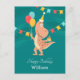 This Happy Birthday Postcard features a cartoon illustration of cute funny Dinosaur wearing birthday hat and holding cake with three lighted candles and three colorful balloons. Great Card for kid's birthday! You can easily personalize the text (greeting and name) at the lower part of the card using Zazzle online tools. If you need help to personalize this card, don't hesitate to contact me via Zazzle, please.